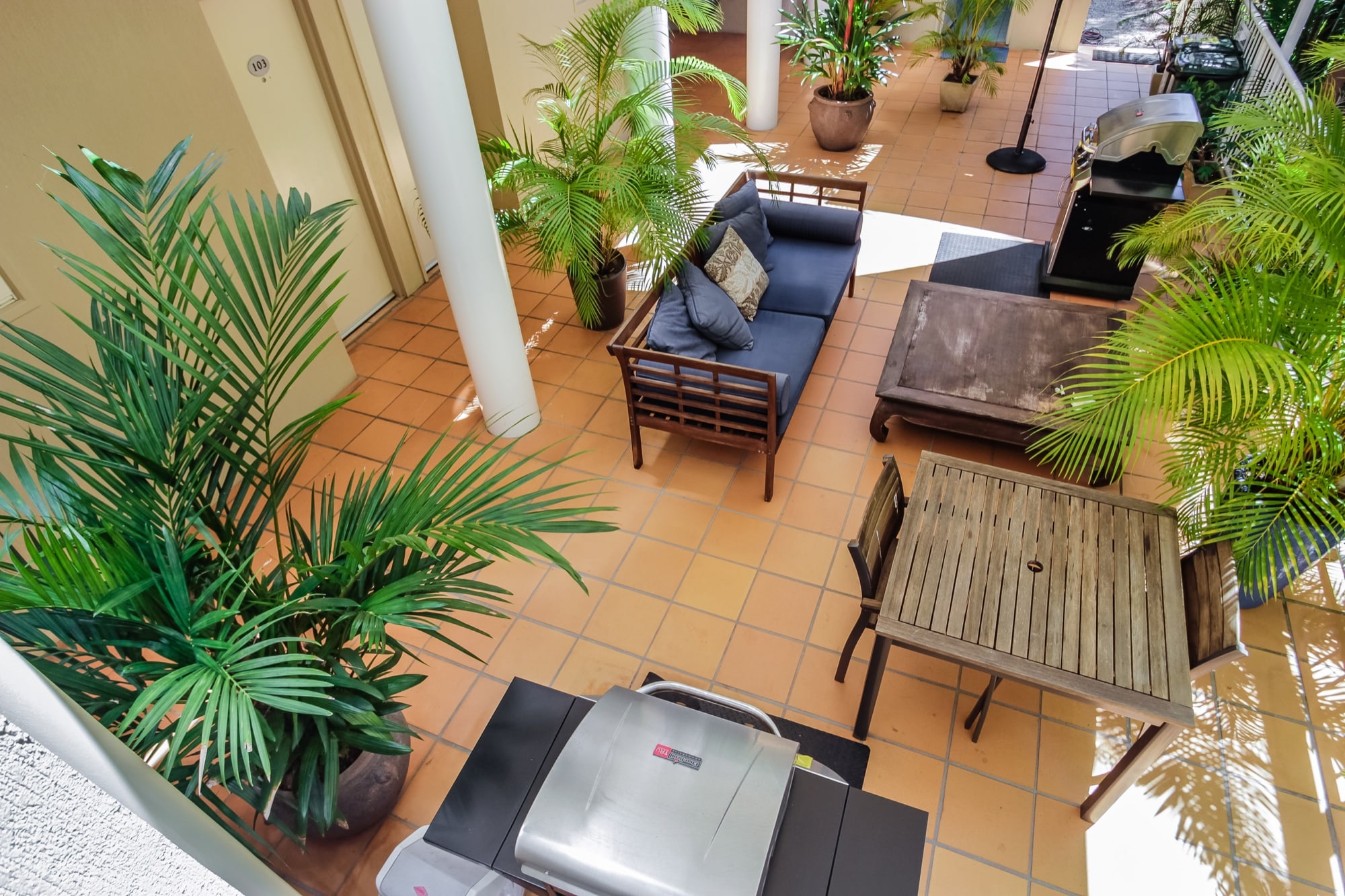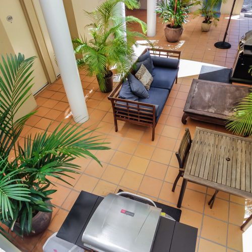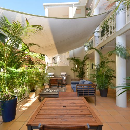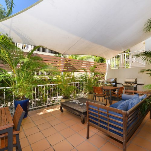The BBQ area is equipped with two BBQ’s, tables and chairs as well an outdoor sofa. This means there’s rarely any wait time to get your dinner started and no reason not to have some company while you do so. It’s well lit and quiet being located at the back of the property and is a great place to socialise.